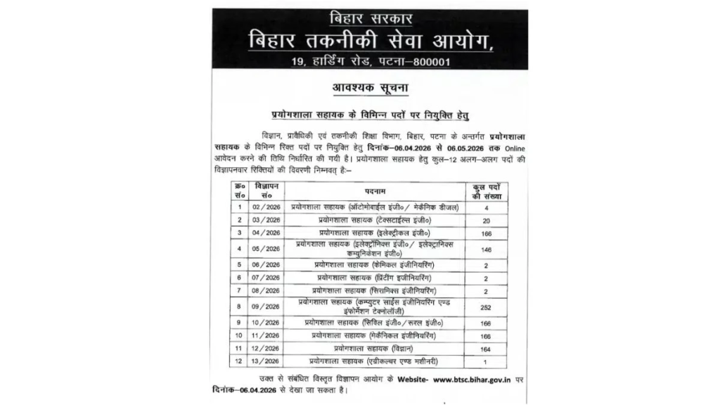 The BTSC has opened applications for the Laboratory Assistant recruitment 2026, offering a total of 1,091 vacancies across multiple engineering and science disciplines. This recruitment is a great opportunity for candidates with a background in science, technology, or engineering to join government institutions in Bihar and contribute to technical and laboratory services. The selection process will include a written examination followed by document verification, ensuring that only qualified and eligible candidates are selected. Interested applicants must apply online through the official BTSC portal between 6th April and 6th May 2026, and candidates are advised to carefully review eligibility criteria, qualifications, and post-specific requirements before submitting their application. With competitive pay and additional benefits, this recruitment is ideal for aspirants seeking stable government employment in the technical field.